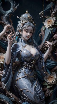 High quality, masterpiece, 1 girl, jiangshi, qing_ Guanmao, no bra,breast curtains,china dress,mudiao,yudiao