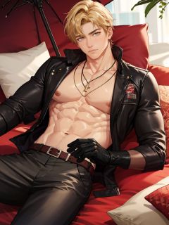 1boy, male focus, gloves, pectorals, blonde hair, jewelry, see-through, black gloves, pants, solo, short hair, necklace, umbrella, belt, abs, holding, bed, pectoral cleavage, jacket, pillow, open clothes, muscular, feet out of frame,<lora:未定事件铺画风-000001:1>,wdsjp, best quality,masterpiece,highres,