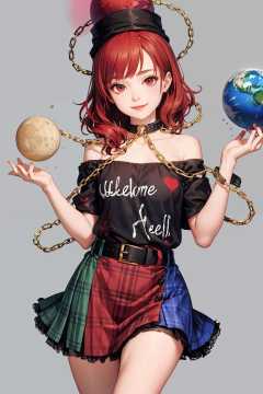 masterpiece, best quality, <lora:HecatiaLapislazuli:1>,1girl,polos crown,red hair,short hair,red eyes,chain,collar,off shoulder shirt,clothes writing,belt,multicolored skirt,plaid skirt,miniskirt, moon (ornament), earth (ornament),grey background, smile