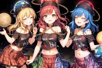 masterpiece, best quality, <lora:HecatiaLapislazuli:1>,smile, shirt, 3girls, blue eyes, red eyes, red hair, blue hair, collar, one eye closed, blonde hair, polos crown, skirt, chain, multiple girls, clothes writing, open mouth, closed eyes, multiple persona, multicolored clothes, looking at viewer, off shoulder, planet, earth (planet), earth (ornament), hat, bare shoulders, navel, off-shoulder shirt, t-shirt, blush, moon (ornament), grin, long hair, multicolored skirt, collarbone, midriff, moon, space, black shirt