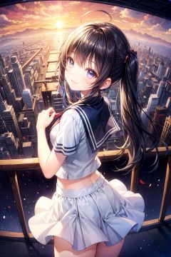absurdres, absolutely resolution, incredibly absurdres, highres, ultra detailed, official art, unity 8k wallpaper, Kinetic TypographyBREAK(1girl, solo:1.4), beautiful and shiny skin, coquettish skin, acrobatic pose, dynamic poses, dynamic angle, close-up, (cowboy shot, from above:1.4)BREAK(smile, happy:1.4), open mouth, blush, extasy, (tilt head:1.4)BREAKass, leaning forward, leaning against the railing, skirt lift, holding the railing, metal railingBREAK(from behind, looking at viewer, looking back:1.6)BREAKblack hair, long hair, twintails, ahoge, linea alba, midriff, thighsBREAKschool uniform, white shirts, short sleeve, black skirtBREAKoutdoors, (sunset, twilight sky:1.4), building, (overlooking the city from the rooftop:1.4)BREAKblurry background, depth of field, bokeh, (fisheye lens:1.2)BREAKnice hands, perfect hands, <lyco:GoodHands-beta2:1.0> <lora:Silicon-landscape-isolation:0.5> <lora:pikas-lighting-isolation:0.5>