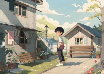 outdoors, tree, mushroom, bag, bird, short sleeves, shirt, white shirt, short hair, holding, cat, black hair, 1boy, shoulder bag, bench, pants, brown footwear, solo, grass, phone, leaf, standing, house, lamppost, rock, male focus, flower, cloud, sky, bangs, smile, shoes, day, building, from side, <lora:chahua_V1_bianping09HF:0.9>, best quality,masterpiece,