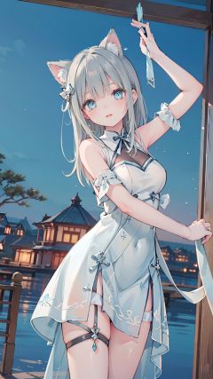 masterpiece,best quality,1girl, blue_eyes, bare shoulders, long hair, dress, ,cowboy shot, dynamic pose, dynamic angle,Cat's ears (Steamed cat-ear shaped bread), fluffy