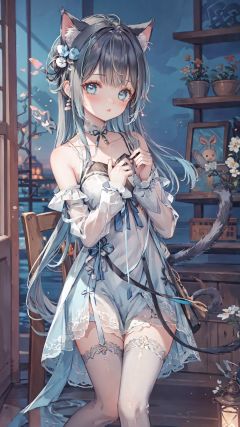 masterpiece,best quality,backlight,Tyndall effect,Crepuscular Rays,blurry,blurry_foreground,depth_of_field,animal_ears,cat_ears,cat_tail,stuffed_cat,cat_girl,tail,long_hair,1girl,blurry_background,striped_legwear,stuffed_toy,striped,stuffed_animal,blue_eyes,blue_hair,very_long_hair,hair_ornament,long_sleeves,collarbone,parted_lips,solo,bangs,hair_bobbles,blush,knees_up,looking_at_viewer,holding_stuffed_toy,holding,qingsha