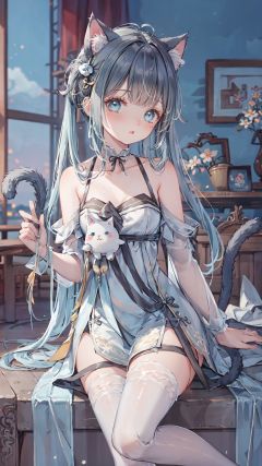 masterpiece,best quality,backlight,Tyndall effect,Crepuscular Rays,blurry,blurry_foreground,depth_of_field,animal_ears,cat_ears,cat_tail,stuffed_cat,cat_girl,tail,long_hair,1girl,blurry_background,striped_legwear,stuffed_toy,striped,stuffed_animal,blue_eyes,blue_hair,very_long_hair,hair_ornament,long_sleeves,collarbone,parted_lips,solo,bangs,hair_bobbles,blush,knees_up,looking_at_viewer,holding_stuffed_toy,holding,qingsha