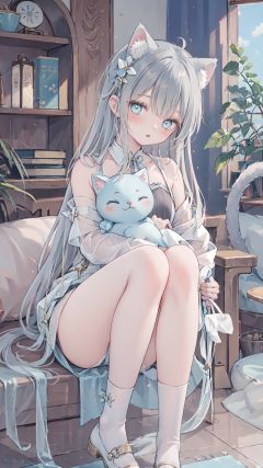 masterpiece,best quality,backlight,Tyndall effect,Crepuscular Rays,blurry,blurry_foreground,depth_of_field,animal_ears,cat_ears,cat_tail,stuffed_cat,cat_girl,tail,long_hair,1girl,blurry_background,striped_legwear,stuffed_toy,striped,stuffed_animal,blue_eyes,blue_hair,very_long_hair,hair_ornament,long_sleeves,collarbone,parted_lips,solo,bangs,hair_bobbles,blush,knees_up,looking_at_viewer,holding_stuffed_toy,holding,qingsha