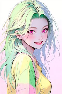 1girl,<lora:neon_v1:0.8>,upper body,yellow shirt,green hair,pink eyes,smile,