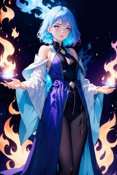 1girl,fantasy,(a pale blue flame:1.4),deep space,(magician robe:1.2),purple loose fitting robe,expressionless,with a indifferent expression,(a few tears shed:0.8),a determined intention,raytracing,colored lighting,color dissolution,dark theme,blue theme