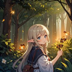 by Hayao Miyazaki,  Ghibli style,  at night,  on a rainy day,  under a bell orchid shaped streetlight,  a cute little girl and a cute forest elf,  with delicate skin,  delicate facial features,  cute clothing,  (((chasing fireflies))) . Behind them are ((a deep fantasy filled art forest background)),  psychedelic dreams,  (((glowing fireflies))),  (delicate raindrops),  glowing plants,  volumetric lighting,  ray tracing,  lighting effects,  shining points,  (Mist),  8K,  2D animation rendering,  Perfect Shadows,  High Resolution