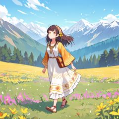 a girl\(full body, bohemian style, flowing dresses, layered clothing, earthy colors, fringe accessories, ethnic prints, natural fabrics\),  walking along flower field in a sunny shiny day, Looking up at the sky, there are snow-mountains in the distance,masterpiece, ultra detailed