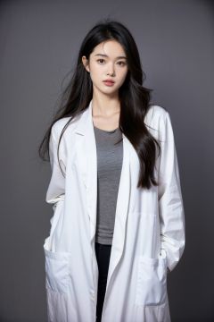 Best quality,masterpiece,ultra high res,photorealistic,1girl,MMN,MN,cho girl,1girl,solo,looking at viewer,studio light,realistic,photorealistic,lab coat,Nickel Gray,a haunted mansion with a deadly past,