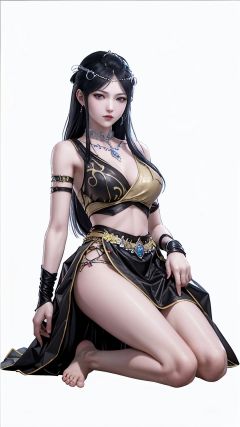 Best quality,masterpiece,lifelike,high definition,A girl,Long black hair,jewelry,Simple background,kneeling&setting on floot,Looking at the viewer,bare feet