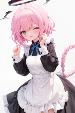 1girl, solo, apron, halo, hair over one eye, closed eyes, smile, white background, dress, white apron, simple background, long sleeves, multicolored hair, braid, open mouth, blue hair, alternate costume, blush, bangs, :d, pink hair, black dress, ribbon, frilled dress, enmaided, short hair, hand up, colored inner hair
