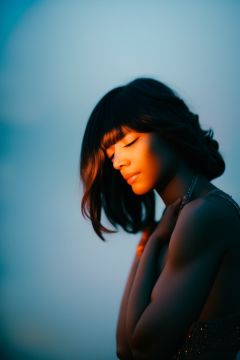 cinematic film still 1girl,closed eyes,light blue,Straight hair,long hair,light cream,upper body,light simple background,looking at viewer,blunt bangs,, . shallow depth of field, vignette, highly detailed, high budget, bokeh, cinemascope, moody, epic, gorgeous, film grain, grainy