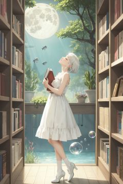 dress, 1girl, book, white dress, bubble, holding, bookshelf, looking up, white hair, moon, sleeveless dress, sleeveless, solo, standing, high heels, socks, air bubble, indoors, book stack, short hair, bangs, wand, underwater, frilled dress, shelf, frills, shoes, white footwear, from side, plant, white socks, full moon, bare shoulders, bare arms, fish, closed eyes, full body, flower, holding book,white background,full body,,white,