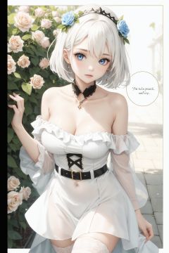 absurdres, absolutely resolution, incredibly absurdres, highres, ultra detailed, official art, unity 8k wallpaper, Kinetic Typography BREAK (1girl, solo:1.4), beautiful and shiny skin, coquettish skin, dynamic poses, dynamic angle, close-up, cowboy shot BREAK (standding, short white hair, beautiful blue eyes:1.2) BREAK (strapless dress, beautiful plunging neckline , belts, leg loops, flower headdress, thighhighs:1.2) BREAK (off shoulder, bare shoulders, bare arms:1.2) BREAK (flower, rose, garden, petal:1.2) BREAK (white theme, english text, border:1.6) BREAK nice hands, perfect hands,