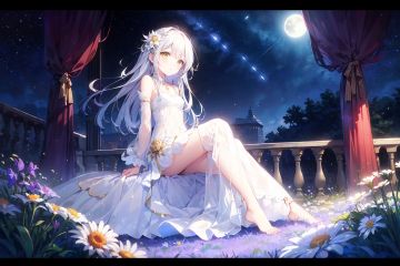 (flat color),colorful,(masterpiece:1,2), best quality, masterpiece, highres, original, extremely detailed wallpaper, (flat color),colorful,(Masterpiece :1,2), best quality, masterpiece, Highres, original, extremely detailed wallpaper, looking at viewer,(mid shot:0.95),(full body:1.25),Dynamic angle,extremely delicate and beautiful,((Balcony)),(nature),(depth of field),amazing,masterpiece,growth,solo,lens flare,she(sitting, admiring the flowers and the moon),loli,little girl,(long sleeves),((arms behind back)),she(long white hair+golden eyes+white simple style transparent dress+hair flower+shiny skin+shiny hair+crystal clear clothes),bare legs,barefoot,Star trail: ((1.3), potted plant, hanging potted the plants, between lamp, potted smallpox, blighting stars, night, elegant, night sky,extremely delicate and beautiful sky,shiny,nebula,star,galaxy,meteor,meteor shower,close-up,petals floating,many flowers,garden,glowworm,daisy, carnation, lavender, lily, chrysanthemum, rose),(looking at viewer)