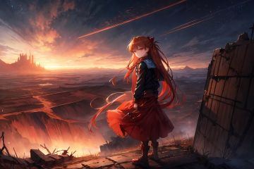 Asuka Langley,post apocalyptic,dystopian,desolate,abandoned,fantasy,science fiction,flowing red hair,long braid,looking to horizon,broken landscape,cratered earth,