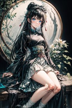 (1girl:0.6), thin, very long hair, black and grey hair,blue eyes, (detailed eyes), small breasts, black coat, white lining,green skirt, socks, closed mouth, (sad), star, Bow head, white flower, (black background), masterpiece, best quality, official art, extremely detailed CG unity 8k wallpaper, cozy anime,midjourney,huansha,east_asian_architecture