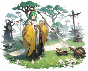 (masterpiece, best quality,top quality),simple background,white background, chinese clothes,solo,1 girl,green hair, full body, brown eyes, long sleeves,(holding a bow),fighting pose,looking at viewer, wide sleeves, holding, standing, no footwear,leg naked, hair ornament, staff, shawl, hagoromo, hair rings, petals, sleeves past wrists, ribbon, earth under feet,grass,(wood tree vine in background),((metal decoration))