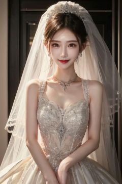 hunsha, 1girl, veil, solo, jewelry, bridal veil, black hair, realistic, earrings, necklace, bride, looking at viewer, smile, red lips