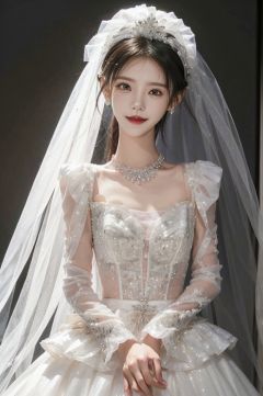 hunsha, 1girl, veil, solo, jewelry, bridal veil, black hair, realistic, earrings, necklace, bride, looking at viewer, kind smile, red lips,,,zhangyuxi