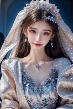 ((Good anatomical structure)), HDR, UHD, 8K, A real person, Highly detailed, best quality, masterpiece, 1girl, realistic, Highly detailed, (EOS R8, 50mm, F1.2, 8K, RAW photo:1.2), ultra realistic 8k,hunsha, 1girl, veil, solo, jewelry, bridal veil, black hair, realistic, earrings, necklace, bride, looking at viewer, smile, red lips,wukelan