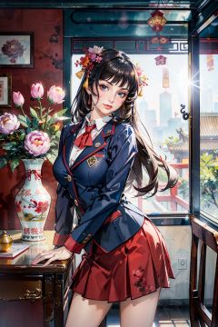 best quality,masterpiece,(naoetsu_high_school_uniform:1.4),(peony (flower):1.2),cowboy_shot,(photorealistic:1.4),unity 8k wallpaper,vase,sunlight,blunt bangs,huasanchuan,(ultra detailed:1.3),(light_on_face:1.4),1girl,blcc,solo,skirt,(looking at viewer:1.2),looking at viewer,(leaning_on_object:1.2),light rays,large breasts,(long hair:1.3),(chinese new year:1.4),outdoors,