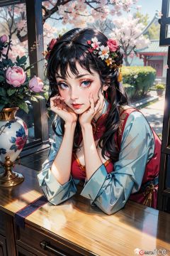 (domineering:1.4),best quality,masterpiece,(landscape:1.3),(peony (flower):1.2),(photorealistic:1.4),unity 8k wallpaper,vase,sunlight,blunt bangs,huasanchuan,(ultra detailed:1.3),(light_on_face:1.4),1girl,blcc,solo,(looking at viewer:1.2),looking at viewer,(leaning_on_object:1.2),light rays,large breasts,(long hair:1.3),outdoors,chinese new year,