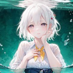 best quality, (chromatic aberration), (beautiful young female:1.4), (streaming tears), sad, (mimosa), (mimosa), (mimosa), looking at viewer, partially submerged, both hands on own cheek, {see-through long shirt},,{no bra} , (white hair, short hair, braid,bangs:1.2), (glowing eyes), ripples, dark water, black background, (prismatic),
