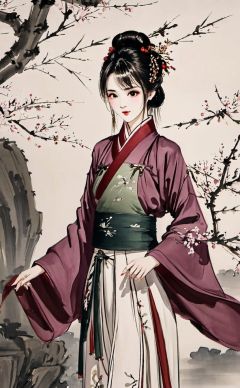 1girl,hanfu,rock,bamboo,plum tree,printing,animal,<lora:suxie:0.85>,hip wrap skirt,business attire,high_heels,