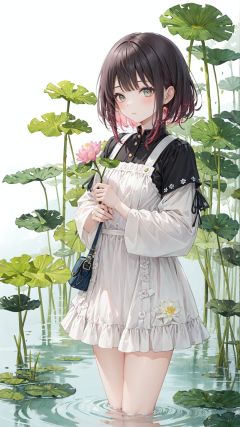 flower, gradient, gradient_background, lily_\(flower\), lotus, 1girl, solo, lily_pad, grey_background, pink_flower, long_hair, dress, black_hair