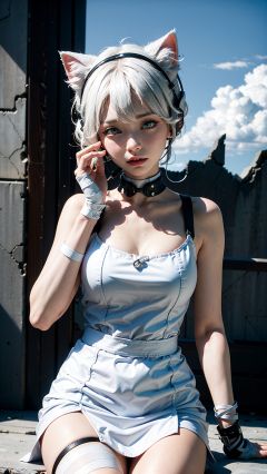 White cat girl, masterpiece, high quality, exquisite wallpaper, 16k, animation, illustration, positive perspective, (Cloudy day :1.4), (Broken walls :1.5), perfect human body, complete body, delicate face, delicate features, handsome girl, little girl, (loli), ((solo)), ((1girl)), ((white cat ears :1.4)), white hair, long hair flowing, (white hair :1.3), beautiful eyes, (different eyes :1.4), \((blue left eye \)), \(golden right eye \)), expressionless, cold expression, simple style clothing, white tone, (headset :1.5), (white jumpsuit minisskirts :1.3), Sleeveless dress, (shed suspenders), white over-the-knee socks, black leg loops, white sneakers, (bandage wrapped around hand :1.5), lean build, slight, ((medium breasts)), (loli build), short height