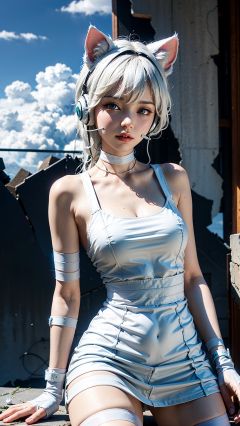 White cat girl, masterpiece, high quality, exquisite wallpaper, 16k, animation, illustration, positive perspective, (Cloudy day :1.4), (Broken walls :1.5), perfect human body, complete body, delicate face, delicate features, handsome girl, little girl, (loli), ((solo)), ((1girl)), ((white cat ears :1.4)), white hair, long hair flowing, (white hair :1.3), beautiful eyes, (different eyes :1.4), \((blue left eye \)), \(golden right eye \)), expressionless, cold expression, simple style clothing, white tone, (headset :1.5), (white jumpsuit minisskirts :1.3), Sleeveless dress, (shed suspenders), white over-the-knee socks, black leg loops, white sneakers, (bandage wrapped around hand :1.5), lean build, slight, ((medium breasts)), (loli build), short height