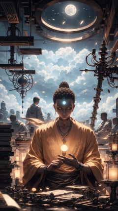 (Best quality, masterpiece), soft lighting, multiple people, Buddha on the subway, dozing off, car window reflection, aerial subway, shrouded in clouds, not looking at the camera, clear theme, moon outside the window, exquisite artistic illustrations, complex digital painting, ultra wide angle shooting, ultra realistic, ultra fine, OC rendering, high detail, ultra high quality, 16k,cyberpunk,steampunk