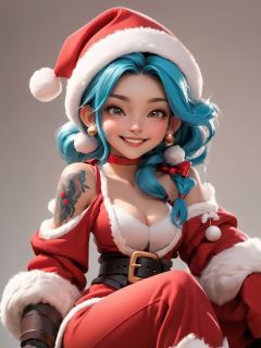 Pixar style, MG_ip,  1girl,  long hair,  jinx \(league of legends\),  solo,  smile,  santa hat,  gradient background,  hat,  one eye closed,  braid,  gradient,  tattoo,  brown gloves,  pants,  sitting,  gloves,  bangs,  blue hair,  red headwear,  belt,  gift,  earrings,  fur-trimmed headwear,  christmas,  jewelry,  brown belt,  grey background,  shoulder tattoo,  bare shoulders,  santa costume,  arm tattoo,  looking at viewer,  shiny hair,  Jinks, <lora:EMS-45923-EMS:1.000000>