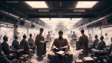 (Best quality, masterpiece), soft lighting, multiplayer, (Buddha standing on the subway), futuristic style, dozing on the armrest, car window reflection, (aerial subway), shrouded in clouds and mist, without looking at the camera, clear theme, purple moon outside the window, octane rendering, neon lights, smoke, exquisite art illustrations, complex digital painting, ultra wide angle shooting, ultra realistic, ultra fine, OC rendering, high detail, ultra high quality, 16k,cyberpunk,steampunk