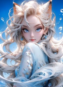 masterpiece, best quality,official art, extremelydetailed cg 8k wallpaper,(flying petals)(detailed ice) , crystalstexture skin, coldexpression, ((fox ears)),white hair, longhair, messy hair, blue eye,looking at viewer,extremely delicate andbeautiful, water, ((beautydetailed eye)), highlydetailed, cinematiclighting, ((beautiful face),fine water surface, (originalfigure painting), ultra-detailed, incrediblydetailed, (an extremelydelicate and beautiful),beautiful detailed eyes,(best quality),CHIBI,monkren