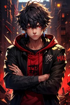 <lora:mn_20231007092457:0.9>,mn,1boy,male focus,red eyes,solo,hood,jewelry,earrings,jacket,hoodie,crossed arms,looking at viewer,black hair,hood down,upper body,hair between eyes,open clothes,red hoodie,open jacket,closed mouth,black jacket,