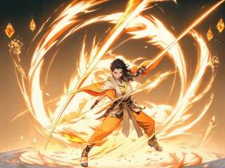 illustration,CG,unity,wallpaper,(((best quality))),((ultra-detailed)),((illustration)),Canon RF 85mm f/1.2L,fam,(full body:1.1),perfect face,perfect body,(high gloss skin:1),1toddler\(1girl, 13year old\),18 year old,android 18,v-shaped eyebrows,hair,eyes,nose,lipstick,(evil smile:1),parted_lips,collarbone,huge breasts,narrow_waist,long_legs,sabaton,Phantom Sword,fighting_stance,dynamic_pose,(holding_weapon:1.1),(flaming_sword:1.3),(((orange-yellow_Crystal_master_sword:1.2))),(glowing_weapon:1.3),(huge_weapon:1.9),chopped upright,bridal gauntlets,xingzijue,shandian,swordsman,<lora:绪儿-武侠martial arts:0.8>,enterthematrix,gleaming sword,<lora:daoguan-10:0.8>,