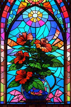 Window, Hibiscus flower, Stained glass, UHD, high details, best quality, 16k