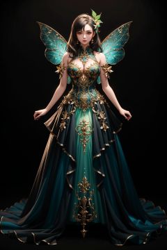((masterpiece)), ((best quality)), 8k, high detailed,1girl, 20-year-old,dress, black background, glowing, green dress, full body, breasts, contouring light, fairy dress