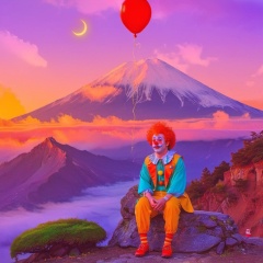 aw0k euphoric style, clown sitting on a mountain fouji, sad expression, <lora:add-detail-xl:1> <lora:vhsart:1>