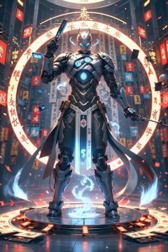 A young mech in silver armor stands in the air, the characters in ancient Chinese novels are sparkling, the silver-clad handsome, the gestures incantation, martial arts immortality, the characters in the palace game are covered in gold runes, cyberpunk-style, neon, best image quality, 3D rendering, head up, super wide angle, fish eyes, full body camera, 16K, super high definition, high resolution, very detailed, best image quality,Daofa Rune