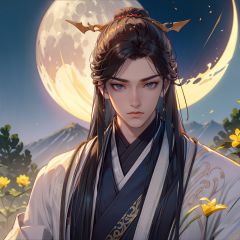 high details, high quality, anatomically correct, textured skin,1 Boy, Male Focus, Long Hair, Solo, Dark Hair, Chinese Costume, Realistic, Blurred, Hairpieces, Outdoors, Polearm, Nature, Looking at Audience, Hand Held,jingxuan,oriental art, wide angle lens, full bright moon in the Sky, Mountains in the distance, rivers in the vicinity, chrysanthemums, osmanthus,