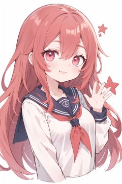 👋,simple background, white background, pentagram, pink eyes, red neckwear, red hair, hair over shoulder, long hair, asymmetrical hair, serafuku, sailor dress, upper body, smile, seductive smile