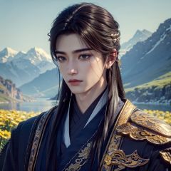 high details, high quality, anatomically correct, textured skin,1 Boy, Male Focus, Long Hair, Solo, Dark Hair, Chinese Costume, Realistic, Blurred, Hairpieces, Outdoors, Nature, Look at Camera,jingxuan,oriental art, wide angle lens, Mountains in the distance, rivers in the vicinity, chrysanthemums, osmanthus,