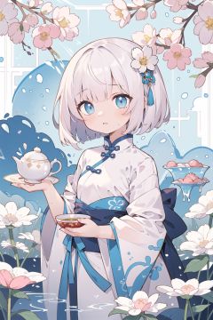 (((masterpiece))),best quality,watercolor,(((illustration)),((Chinese_style)), (((beautiful detailed girl))),small chest,cat,tea, ((delicate cute face)),blue_eyes,watery_eyes, bob_cut,white_hair,flower, (hanfu),silky,pink,luxuriant,layered dress, (in_spring),beautiful_landscape,light particles,(((masterpiece))),best quality,watercolor,(((illustration)),((Chinese_style)), (((beautiful detailed girl))),small chest,cat,tea, ((delicate cute face)),blue_eyes,watery_eyes, bob_cut,white_hair,flower, (hanfu),silky,pink,luxuriant,layered dress, (in_spring),beautiful_landscape,light particles,