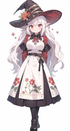 (masterpiece:1.2),(arms behind back:1.2),best quality,game cg,1girl,solo,long hair,white hair,hair ornament,dress,full body,looking at viewer,simple background,red eyes,standing,hair flower,white background,white dress,closed mouth,long sleeves,skirt,wavy hair,blush,large breasts,smile,very long hair,hand up,floral print,witch hat,elf,