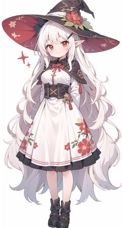 (masterpiece:1.2),(arms behind back:1.2),best quality,game cg,1girl,solo,long hair,white hair,hair ornament,dress,full body,looking at viewer,simple background,red eyes,standing,hair flower,white background,white dress,closed mouth,long sleeves,skirt,wavy hair,blush,large breasts,smile,very long hair,hand up,floral print,witch hat,elf,